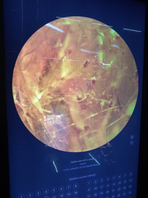 有的琥珀因為太小快了十在看不清楚到底裡面包什麼,旁邊還有電子互動板可以點選放大跟介紹。像下面這個裡面包的就是蜘蛛網,很特別吧!