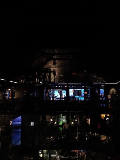 走到牆邊看到有一面很大的牆面加上很多窗戶,對應一開始拍到的很美雪景建築外觀。但是內部有點暗拍著不太清楚。