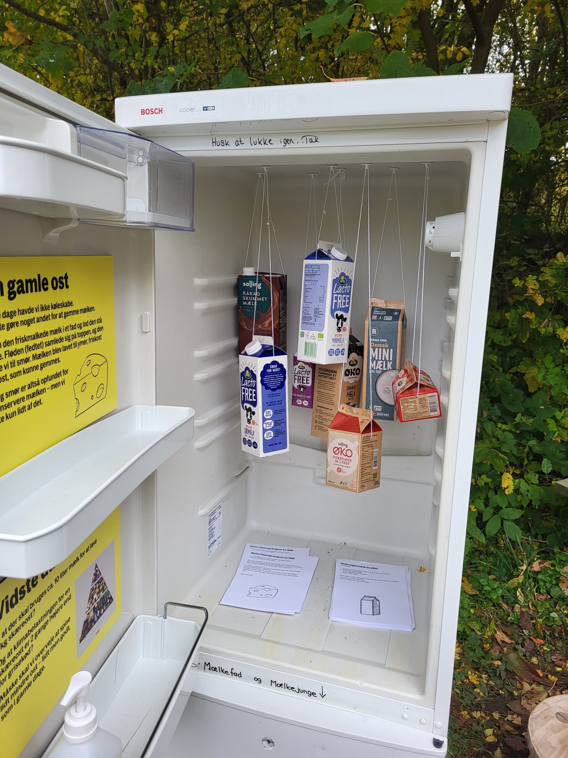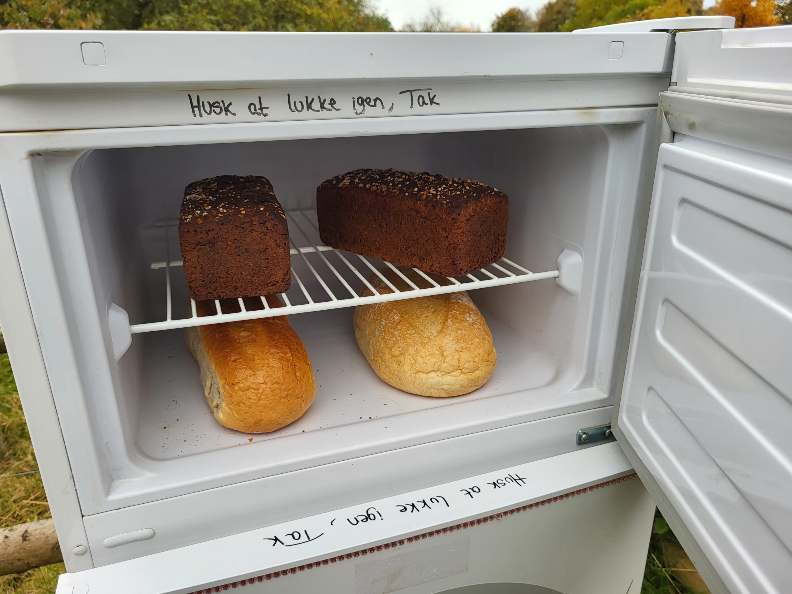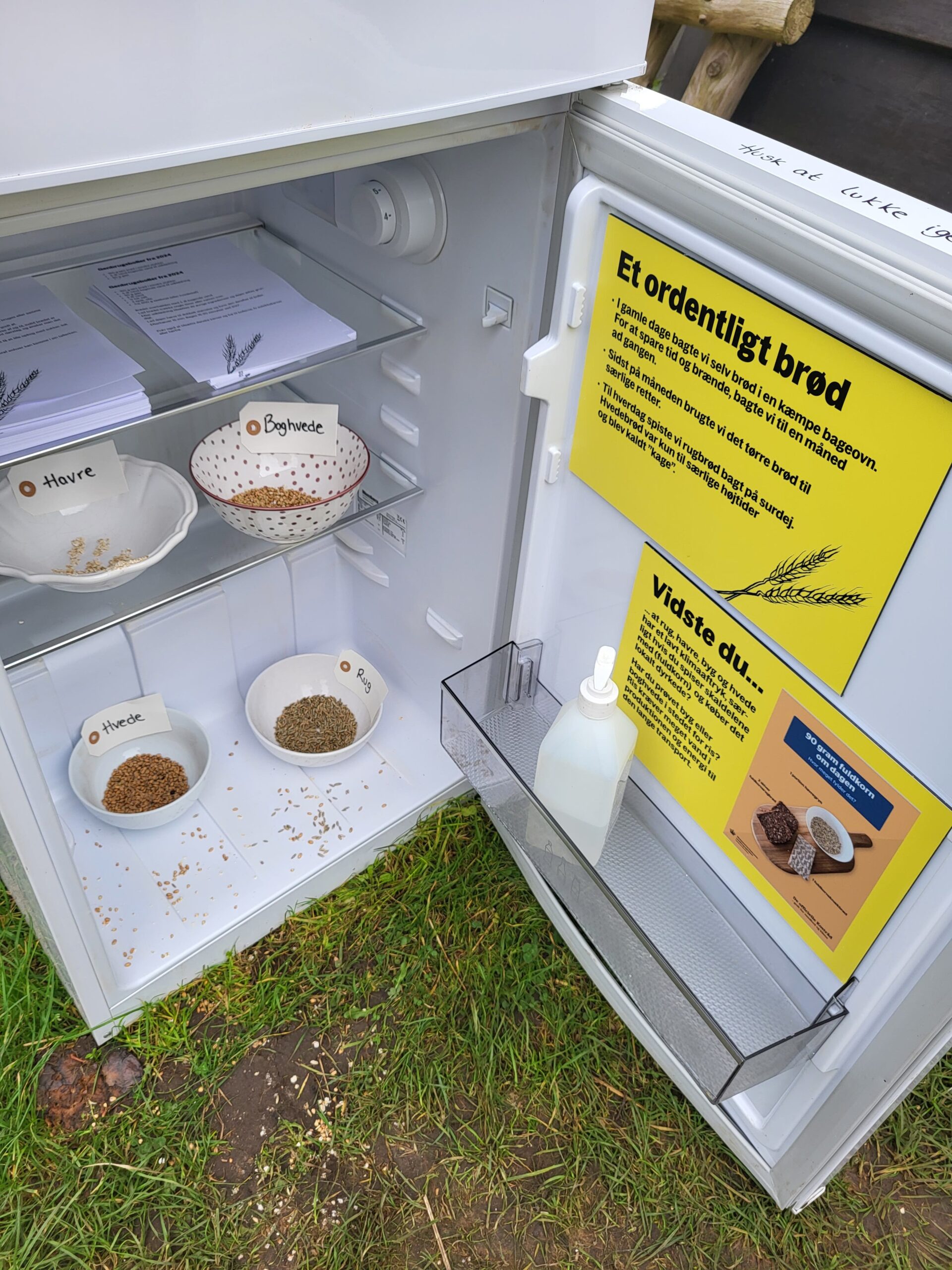 然後綿羊旁邊有一個冰箱,冰箱原本我以為是一些可以餵食的東西,但裡面展示的好像是水車研磨的穀物,然後上面上層的話就是用那些穀物做成的麵包。麵包也都還蠻新鮮的聞起來有香氣!!