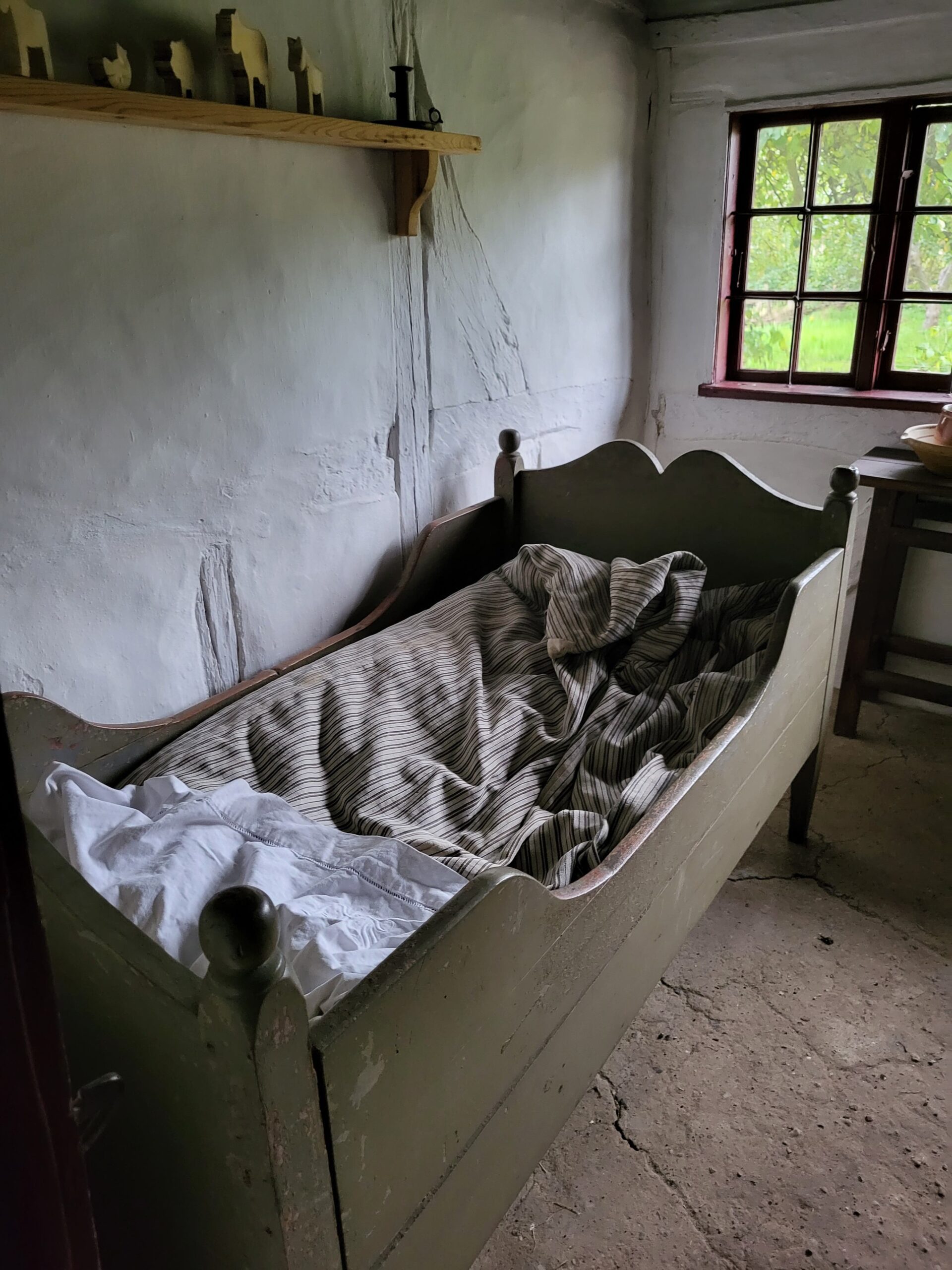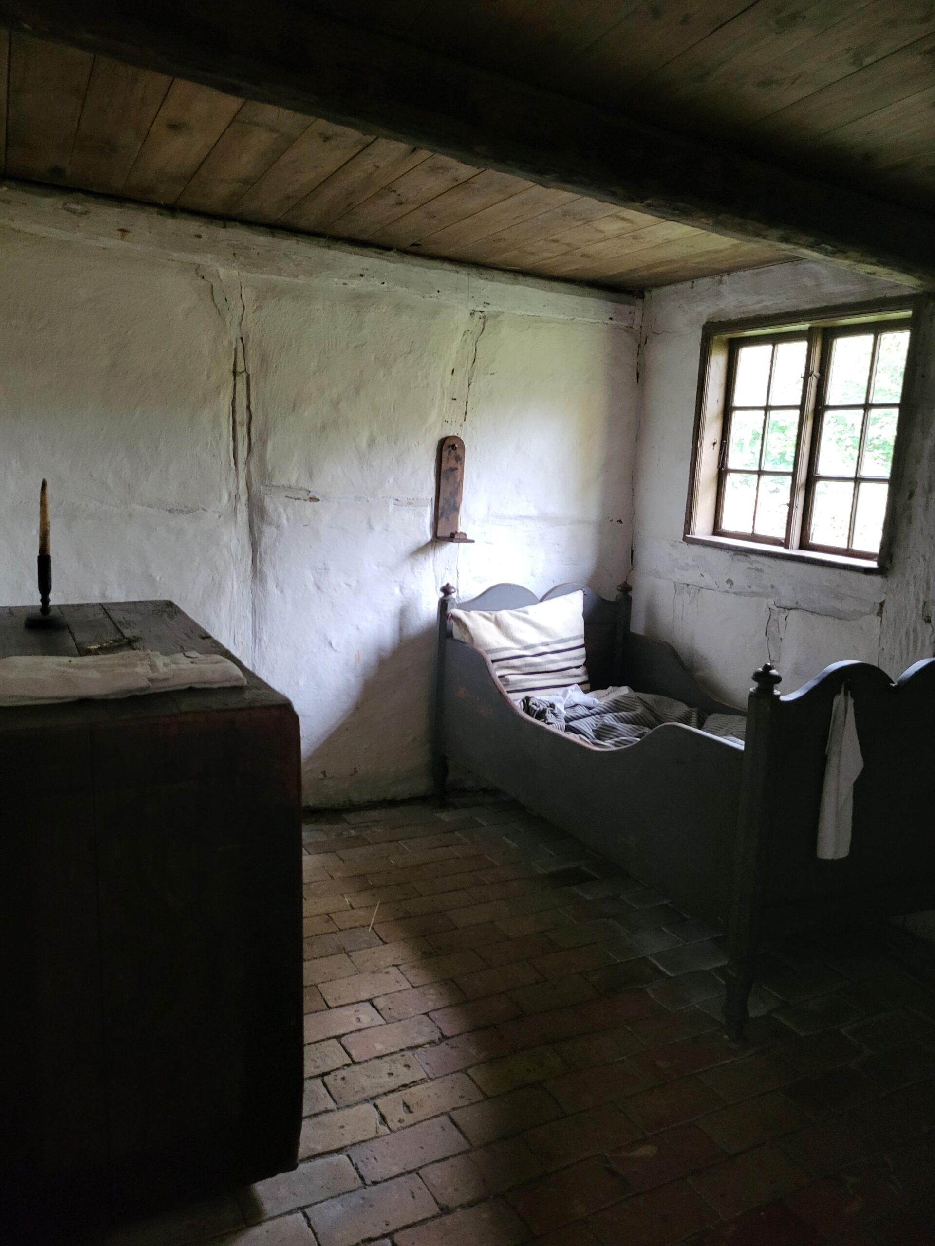 意外的是這個床看起來有點小就是,感覺就連我這種身高的躺下去都有點擠,有點多不太符合北歐人身高的感覺,也許以前古代人長得比較矮?然後屋頂也是比較矮的那種走進去很有壓迫感。
