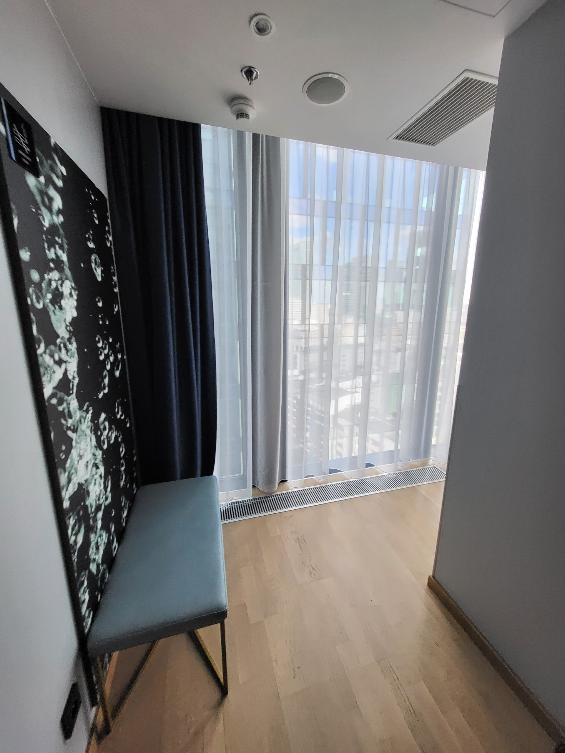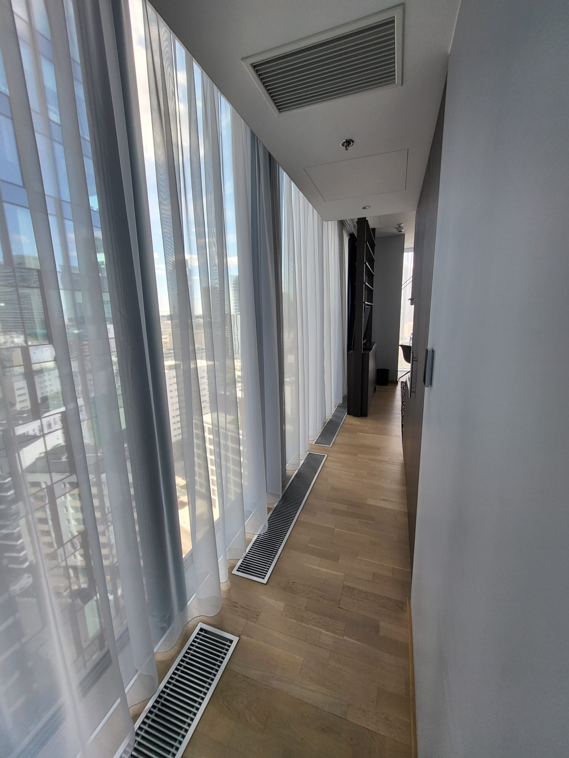 我們的房間可能因為是邊間的關係,一進去有長長的L型走廊,走廊一側是很大片的落地窗,一整片的透明玻璃窗。貼近窗戶往下看的時候其實有一點可怕。